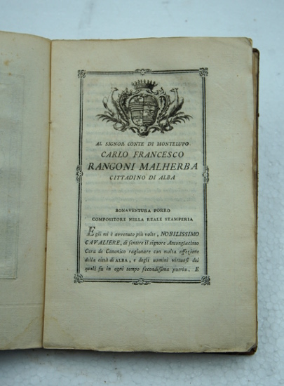 In 8vo (cm 18,5x13). Prima edizione. Legatura in pelle coeva, piatti inquadrati a secco. Pag. 16-68, bell'antiporta incisa in rame del Gizzardi , testo incorniciato con filetti. -- L'opera composta nel 1560 non fu mai pubblicata , questa è dunque la prima edizione, Parenti 474 la reputa rarissima. Lastri 174, Gamba 1678. ottimo e marginoso esemplare.